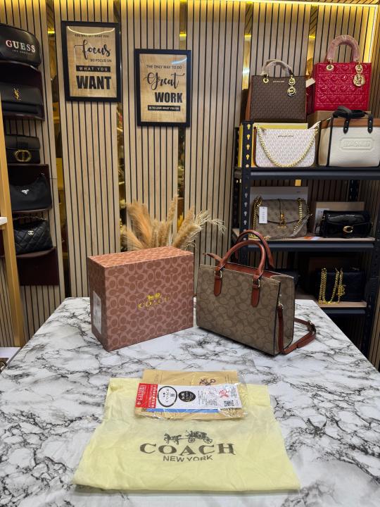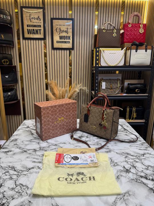 Coac_h Maggie Medium Leather Tote Bag In Blocked Signature Canvas With Box And Dust Bag (Apricot-7933)