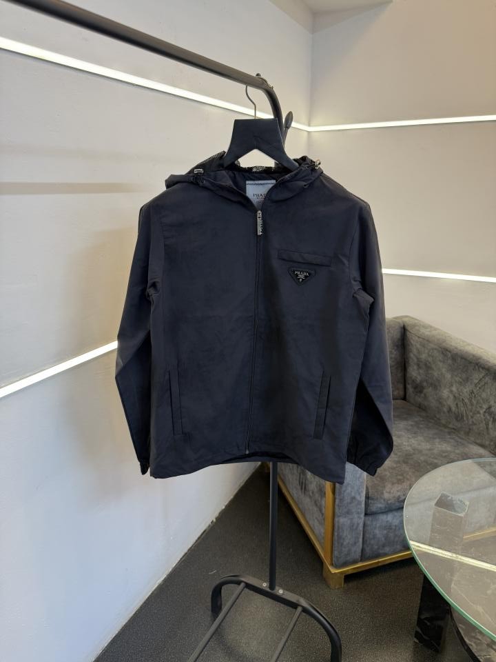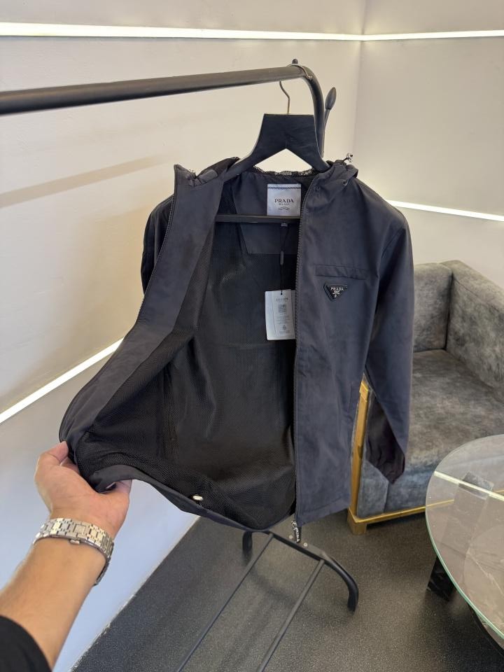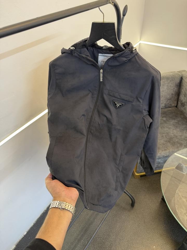 ? *Prad a imported wind cheater washing look fabric F zipper with hood imported prada metal logo on front with pocket flap and original zip as store now in stock*?
